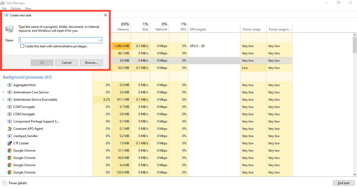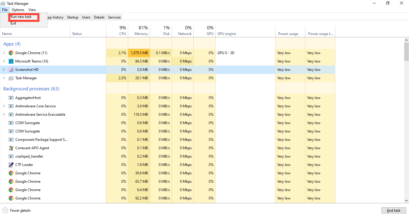 Step 2. Click "Run a New Task" at the top of the Task Manager window. Here, you will see a dialogue box where you can type commands.