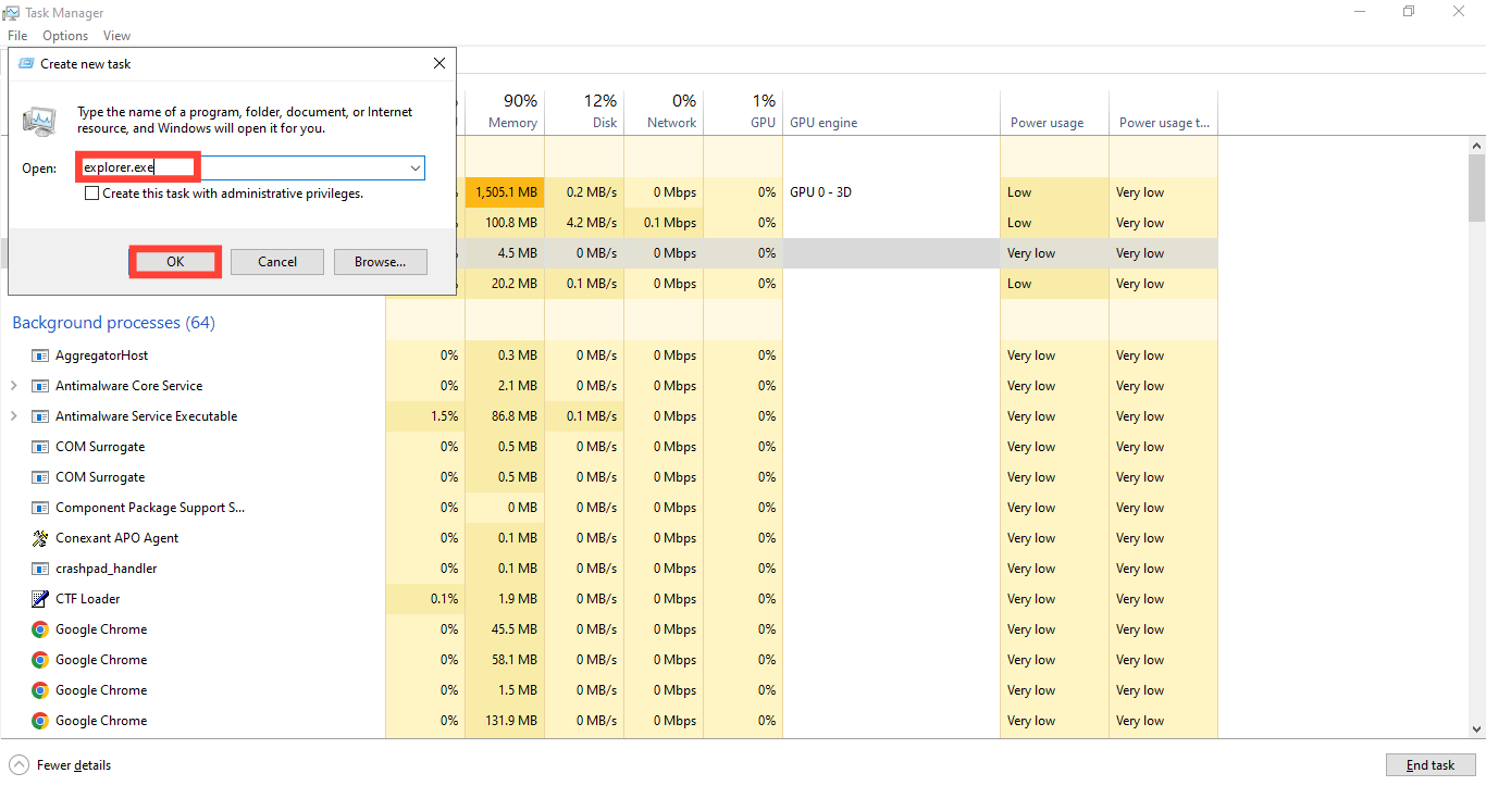 Step 3. Type "explorer.exe" and tap "OK" or "Enter". This will restart the Windows Explorer process and restore your screen to normal.