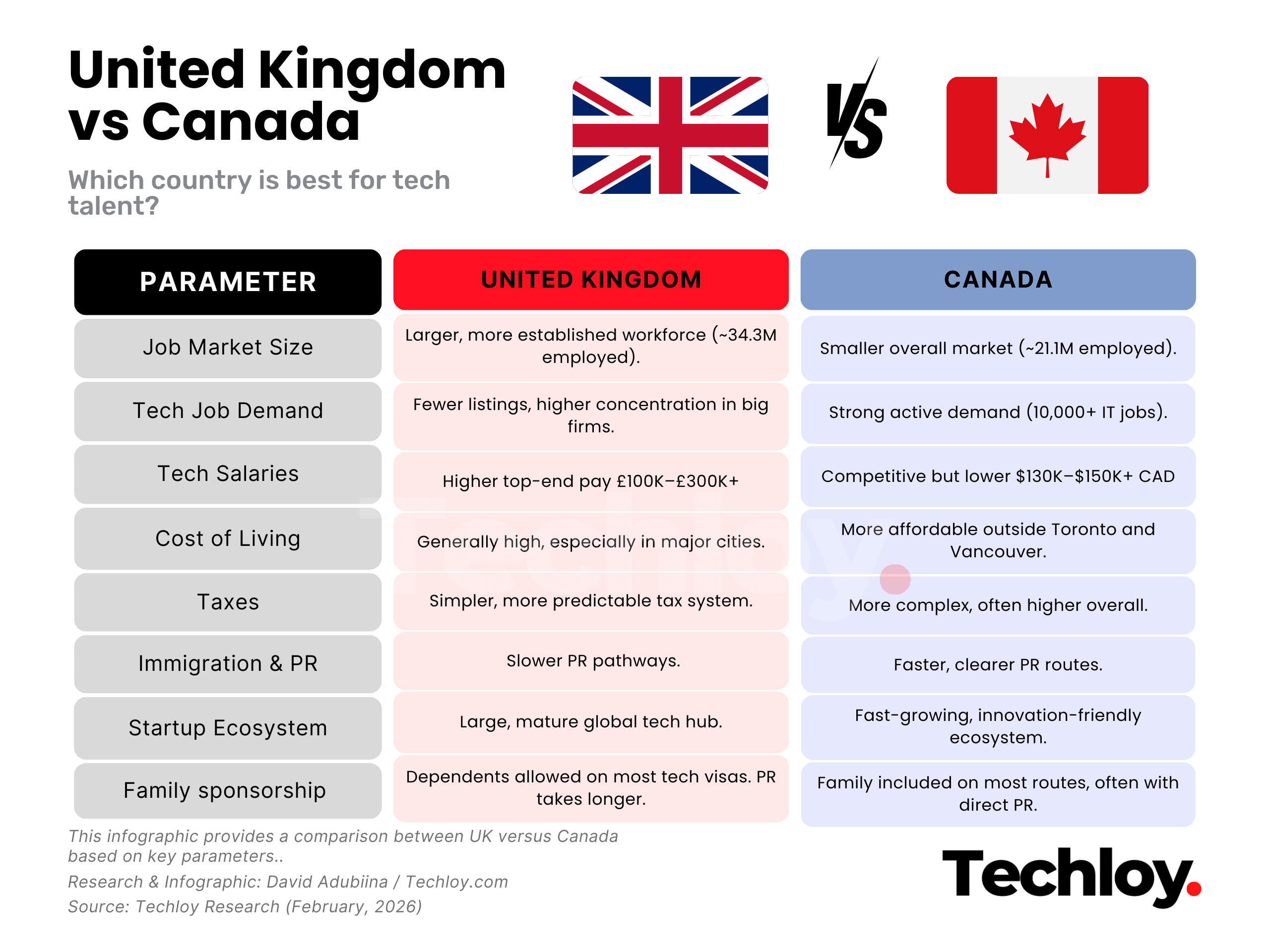 If you want the highest salaries and the biggest, most established tech ecosystem, the UK comes out as a top pick. But if your priority is an environment with strong talent demand, faster immigration, and clearer PR pathways, Canada is the more advantageous destination.