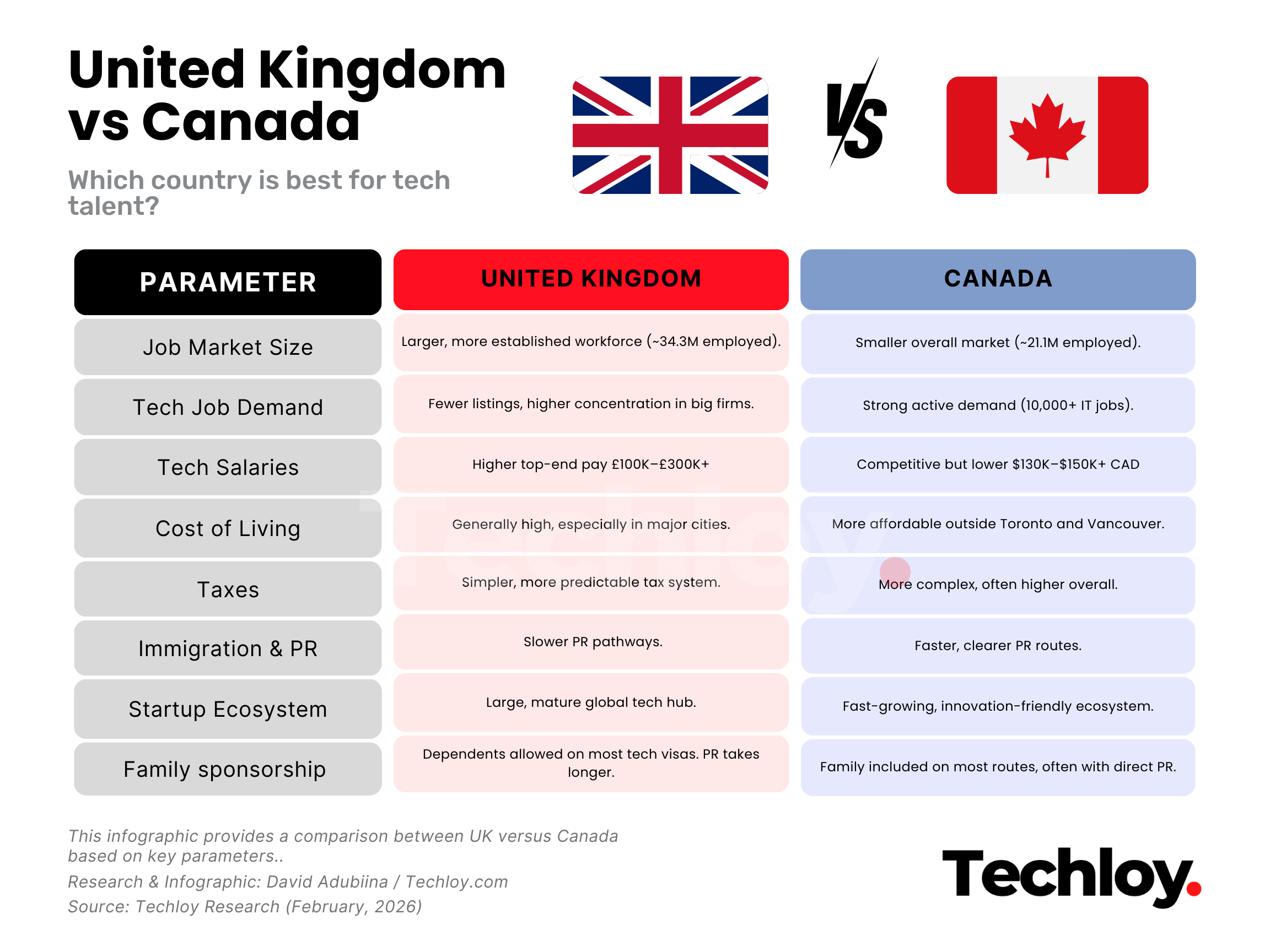 If you want the highest salaries and the biggest, most established tech ecosystem, the UK comes out as a top pick. But if your priority is an environment with strong talent demand, faster immigration, and clearer PR pathways, Canada is the more advantageous destination.