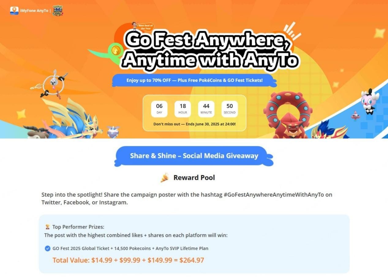 Don’t worry, if you’re on a budget, there’s still a way to join. AnyTo is running a special GO Fest giveaway. You’ll have a chance to win a free event ticket, a permanent SVIP license, and even up to 14,500 PokéCoins. Here’s how to join: