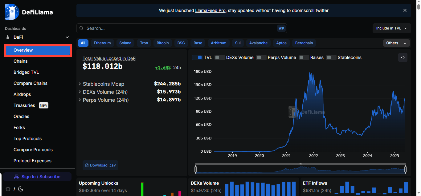 - On the homepage, you’ll see multiple tabs like “TVL,” “Yields,” “Stablecoins,” etc. For this, stick with Overview or DEX Volume, depending on what you’re tracking.