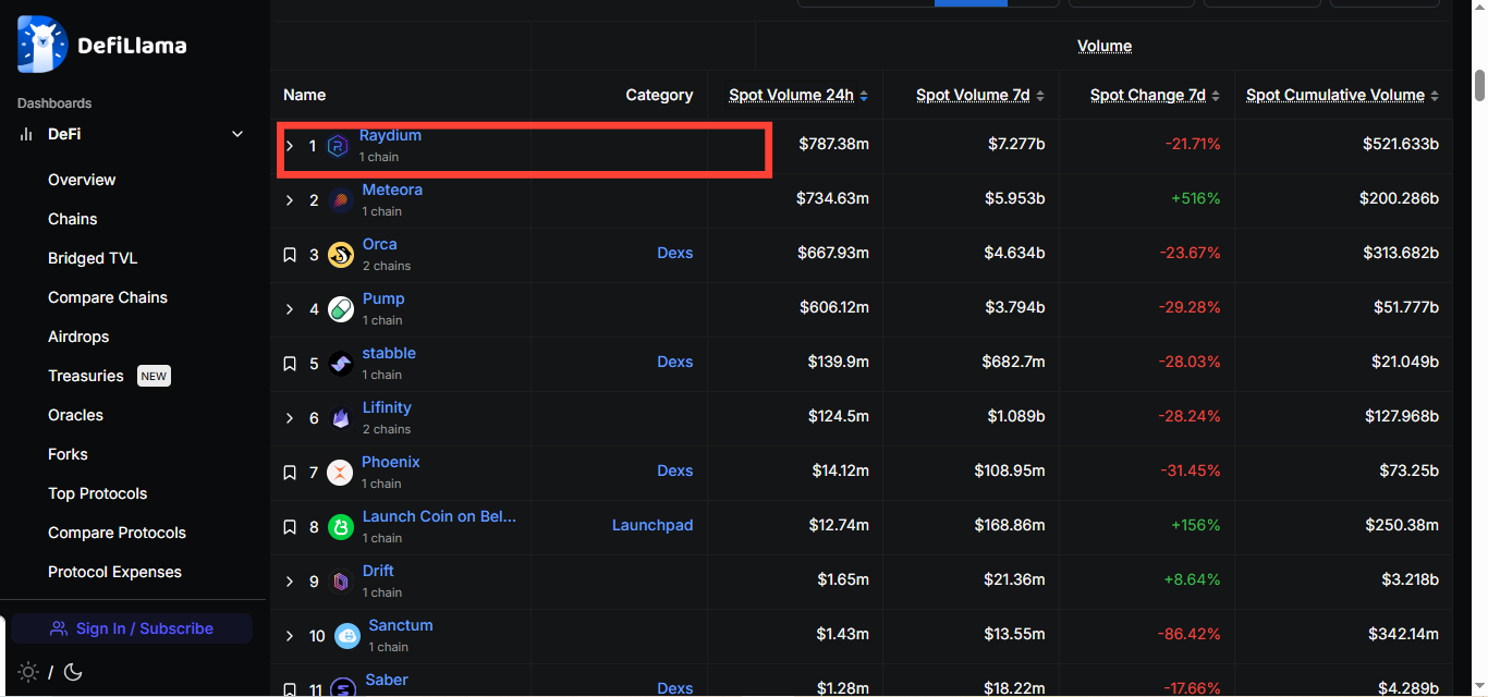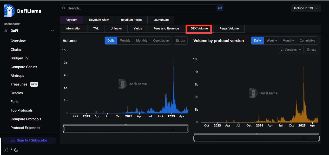 - Let’s say you’re looking at Solana. You’ll probably find DEXs like Orca or Raydium. Click into one of them to see detailed volume data, including daily, weekly, and monthly on-chain trading activity.