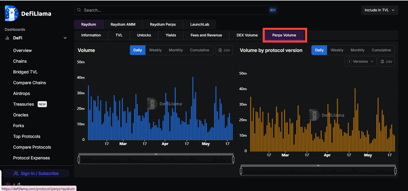 - Once inside, click on DEX volume or Perps volume, depending on the on-chain volume metric you are looking for. You’ll see graphs showing daily trading volume, weekly, monthly, and cumulative. The volume section is what you want, that tells you how much trading is happening on-chain for that coin.
