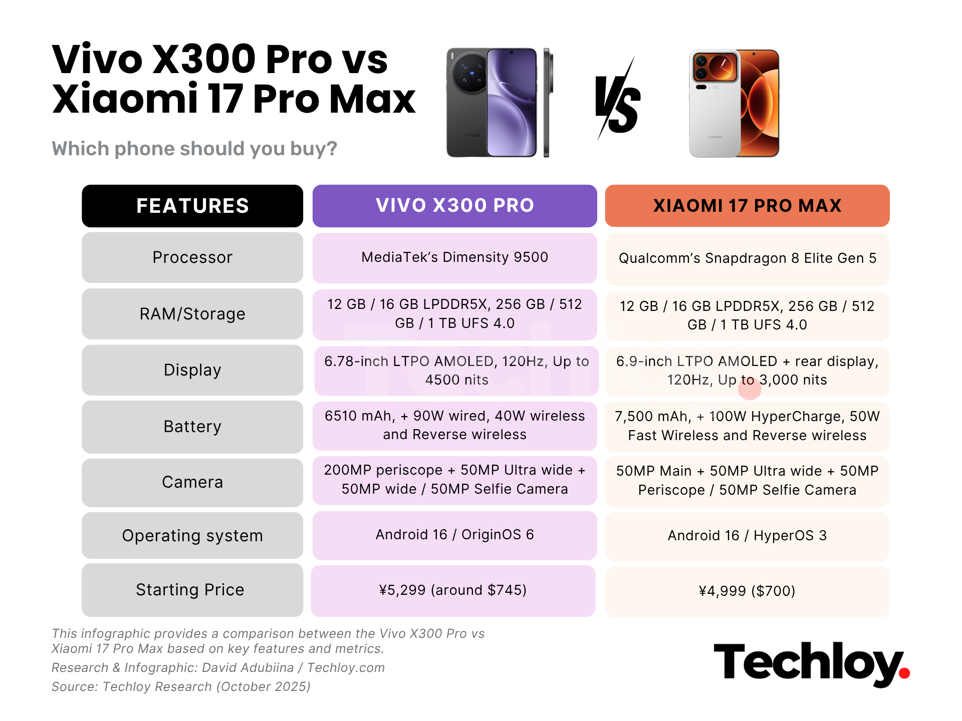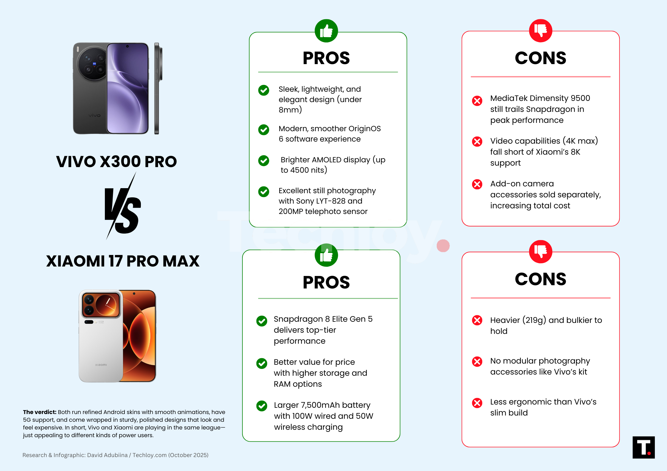 Both the Vivo X300 Pro and Xiaomi 17 Pro Max offer their best when it comes to performance, quality, and flagship-level specs. If you want something sleek, balanced, and built with photographers in mind, the Vivo X300 Pro is the better pick. Its refined design and pro-grade camera setup make it ideal for creators who care about image detail and color accuracy. While it doesn’t hit the same raw power levels as Xiaomi, its efficiency, smooth software, and premium feel make it worth every cent for everyday users and photography enthusiasts alike. But if you want long battery life and a feature-packed experience, Xiaomi’s 17 Pro Max is a pick you might want to consider. The Snapdragon 8 Elite Gen 5 chip and massive 7,500mAh battery give it a futuristic edge that few rivals match. It has a bit more weight, but it makes up for it with all-around capability and top-tier performance. For me, it’s a win for the Xiaomi 17 Pro Max not just for its versatility and power, but for the value it delivers at its price point. What do you think?