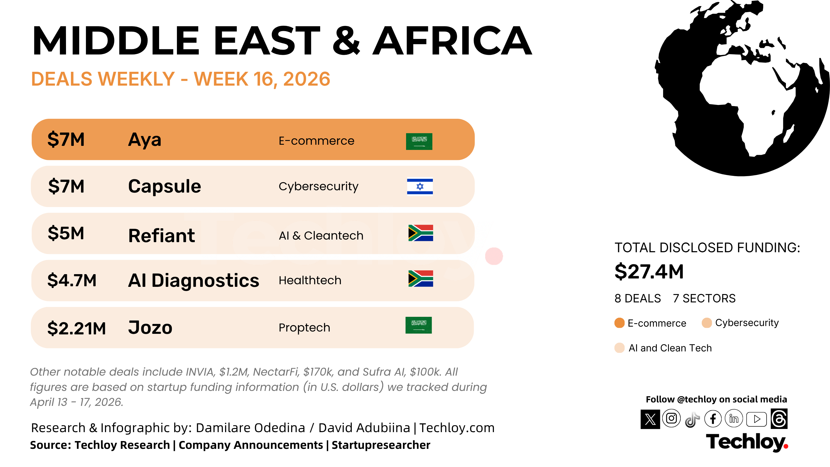 Startups across Africa and the Middle East raised a combined $27.4 million this week, based on disclosed funding rounds tracked by Techloy, with investor capital flowing into fashion tech, cybersecurity, clean energy, and healthtech. Early-stage deals made up the bulk of the week's activity, spanning Saudi Arabia, Israel, South Africa, Egypt, Nigeria, and Qatar.