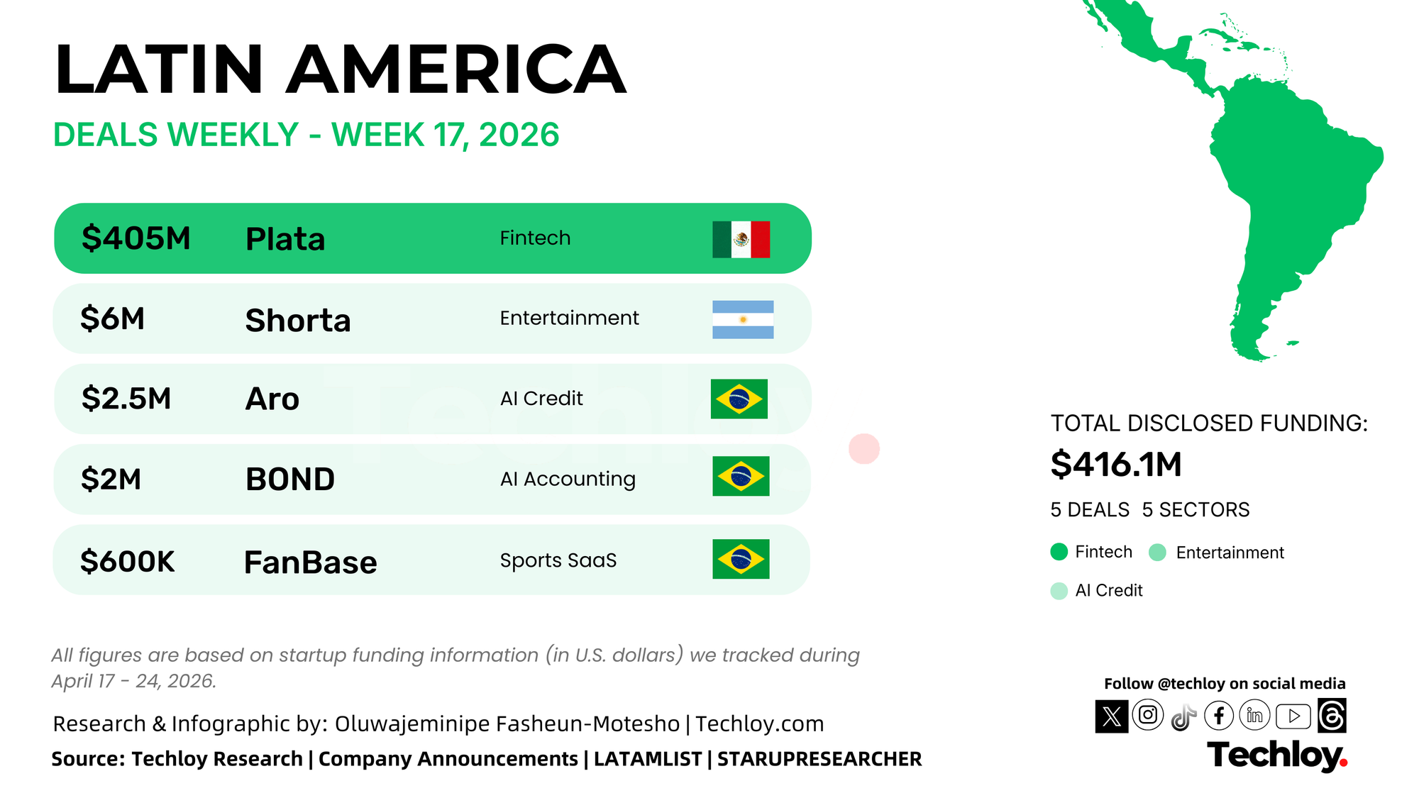 Startups across Latin America raised a combined $416.1 million in disclosed funding this week, based on deals tracked across the region. The largest rounds came from fintech and digital banking companies, followed by AI, accounting, and entertainment startups building new digital platforms for scale.