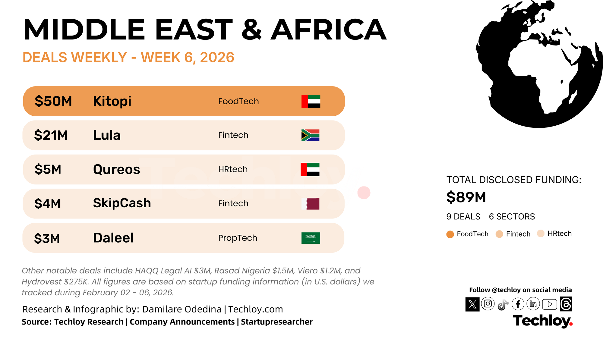 Startups across Africa and the Middle East raised a combined $89 million this week, based on disclosed funding rounds tracked by Techloy, with investor capital flowing primarily into food technology, payments, and AI-powered platforms. One large growth-stage deal accounted for most of the week’s funding activity.