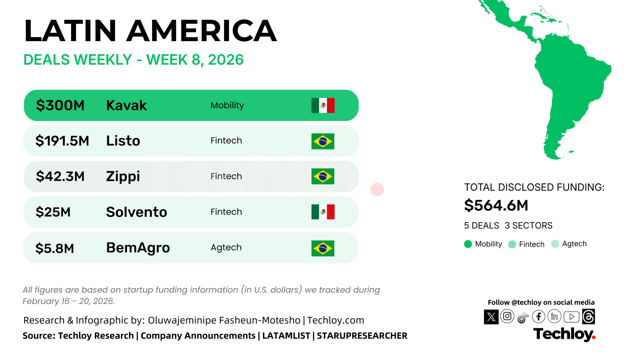 Startups across Latin America raised a combined $564.6 million this week, based on disclosed funding rounds tracked by Techloy. The majority of the capital went to fintech companies, especially those focused on credit and automotive finance. A single mega round accounted for more than half of the total funding.