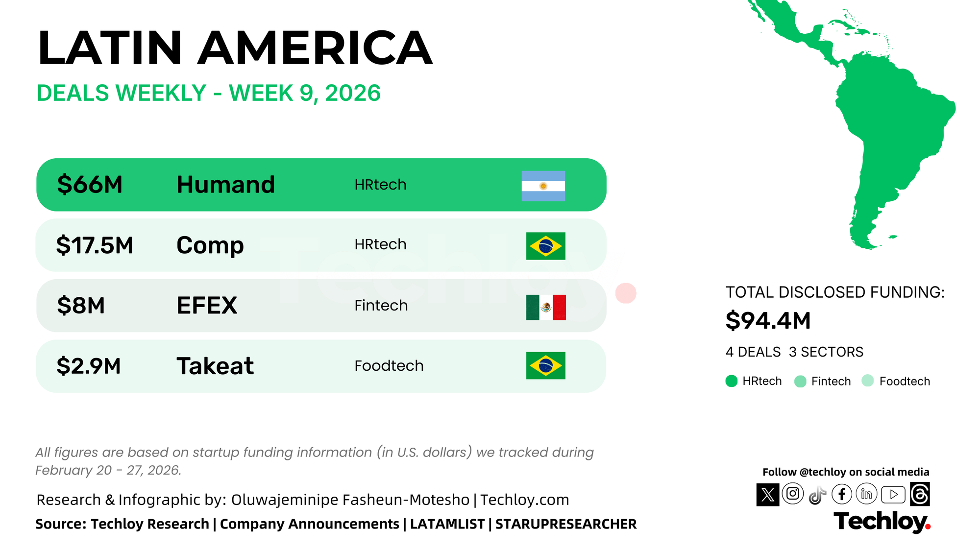 Startups across Latin America raised a combined $94.4 million this week, based on disclosed funding rounds tracked by Techloy. Most of the capital went to HRtech platforms building tools for compensation, recruiting, and workforce management. Meanwhile, fintech and foodtech startups raised smaller but strategic rounds.