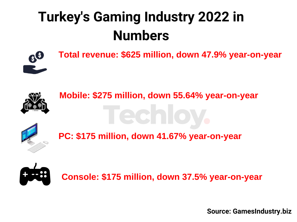 Turkey's gaming market experienced a decline at the end of 2021, reaching a sales value of $1.22 billion, making it the 18th largest in the world. The drop in sales was reportedly caused by the devaluation of the Turkish lira, which lost 42% of its value against the US dollar in 2022.