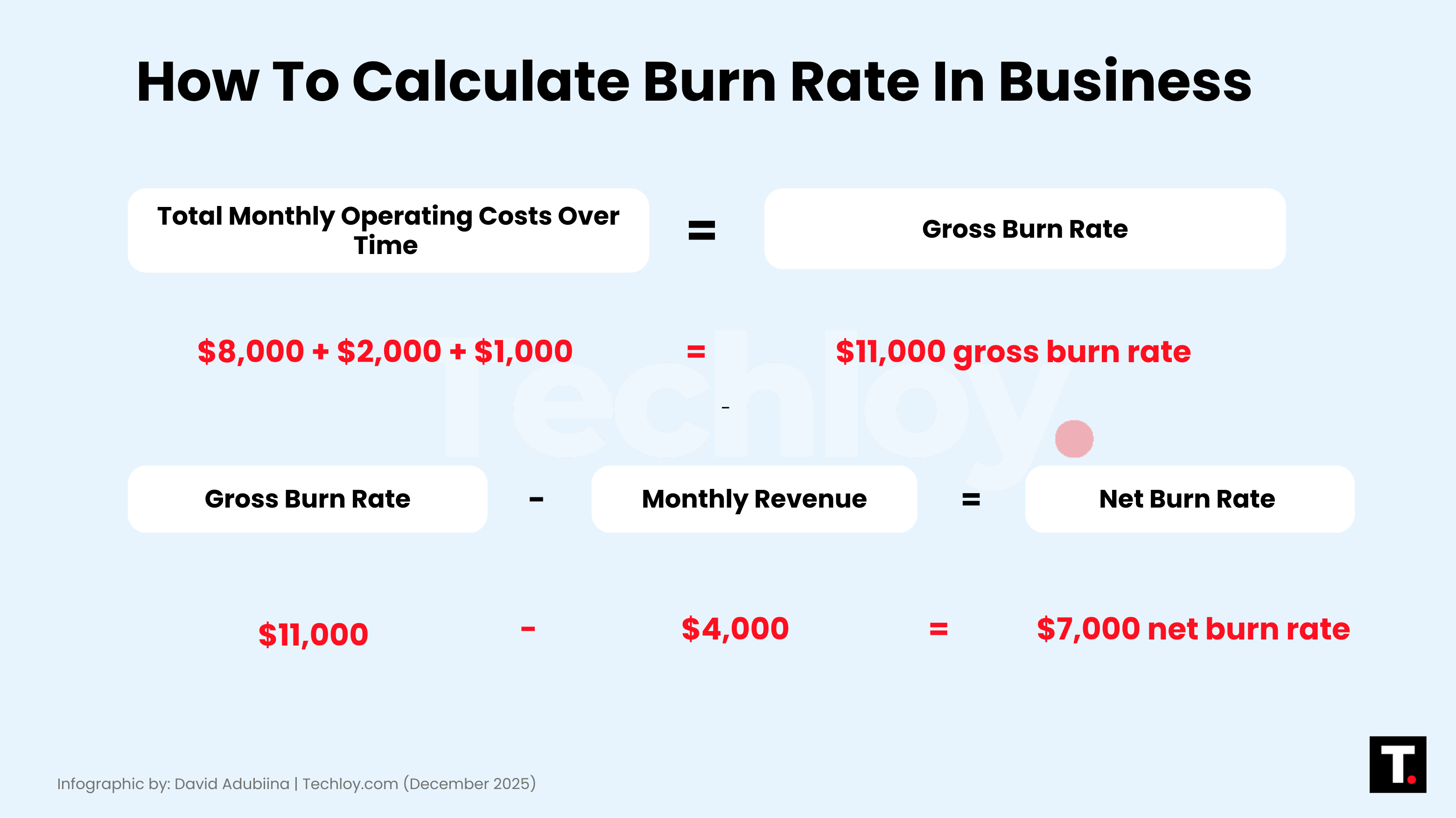 For example, if your gross burn rate is $11,000 and the company makes $4,000 in monthly revenue: