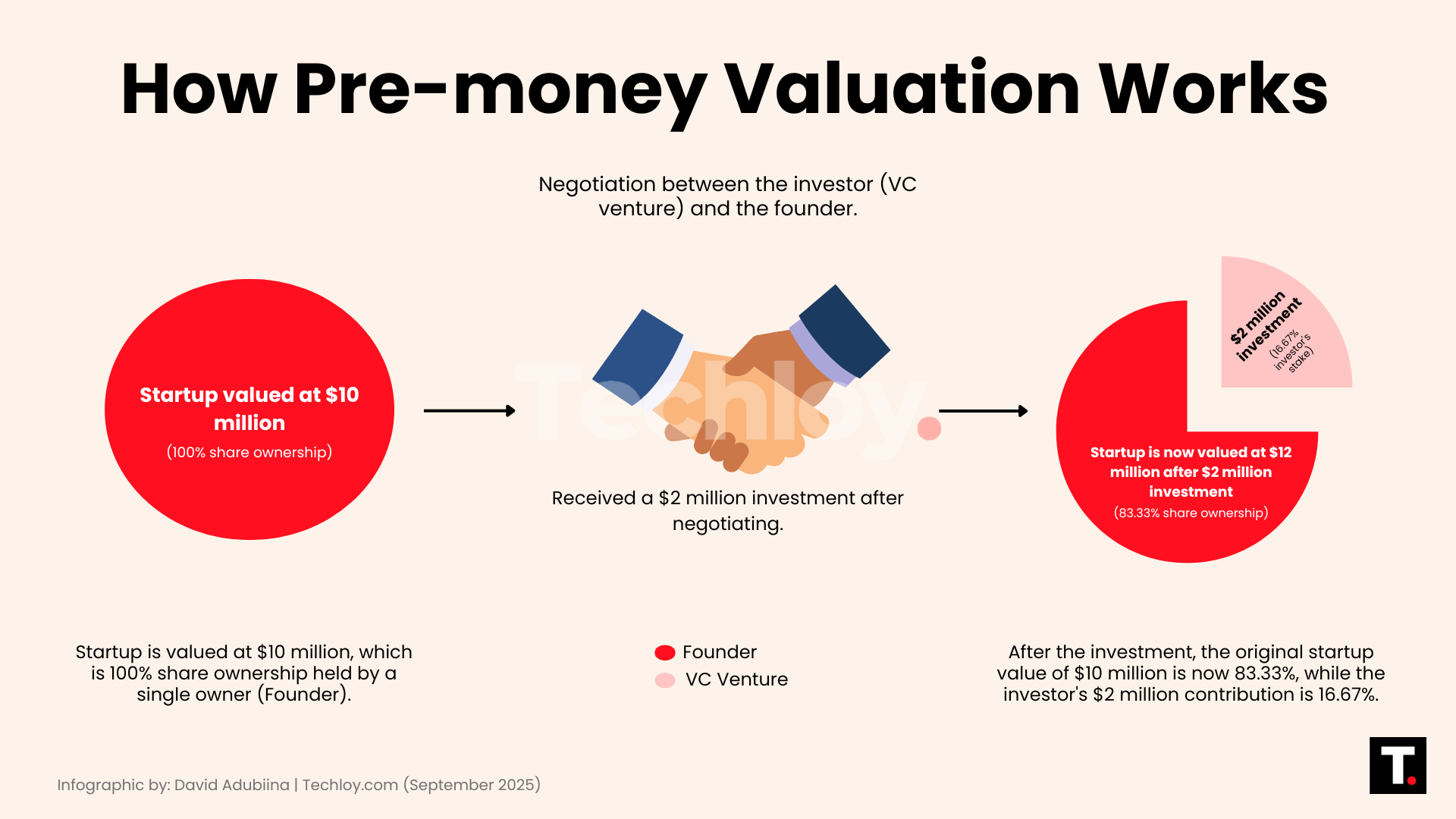 So, if a startup is valued at $10 million before funding, and an investor puts in $2 million, the new value after the deal (post-money valuation) is $12 million. That $2 million now represents 16.67% of the company ($2M Ă· $12M).