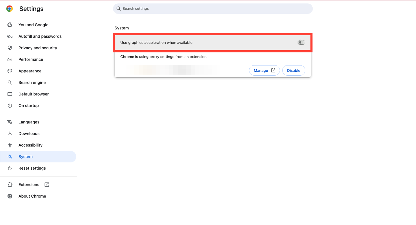 - Find "Use graphics acceleration when available" and toggle the switch OFF.