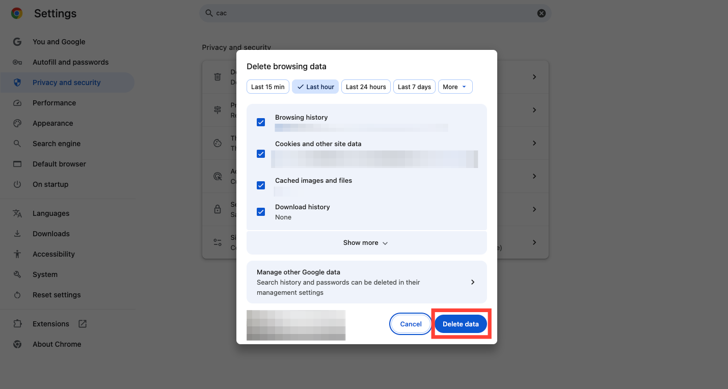 - Check the boxes for "Cached images and files" and "Cookies and other site data."