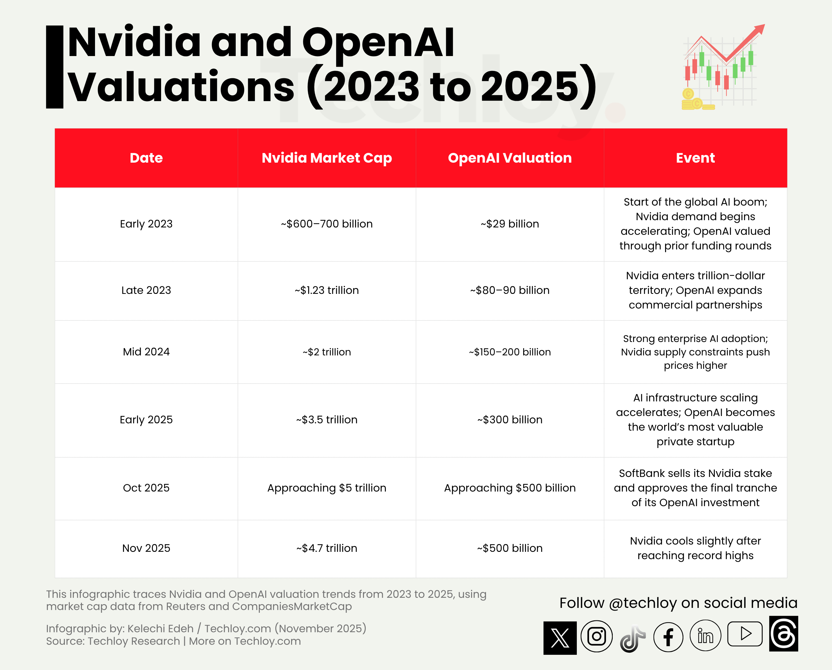 OpenAI, meanwhile, was on a very different path. A secondary transaction in late 2025 pushed the company toward a $500 billion valuation, reflecting growing confidence in the platform and model layers. Nvidia was valued as the leader of the present. OpenAI was valued as the engine of the future.