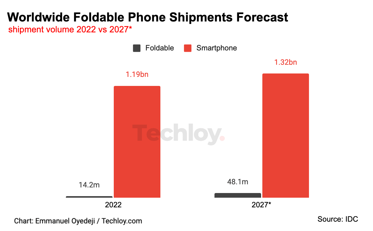 This represents an increase of more than 50% over the 14.2 million units shipped in 2022. This was driven by a 10% decline in ASP (Average Selling Price) which helped the market grow 75.5% in 2022, as foldable devices became more affordable in numerous markets.