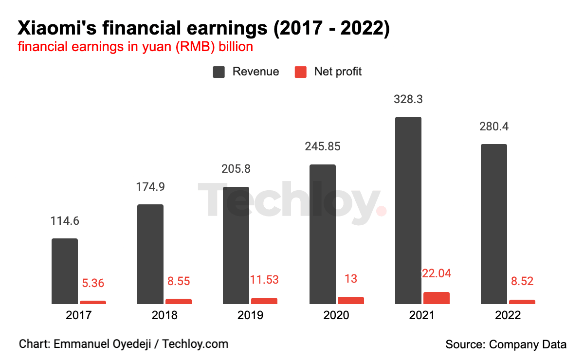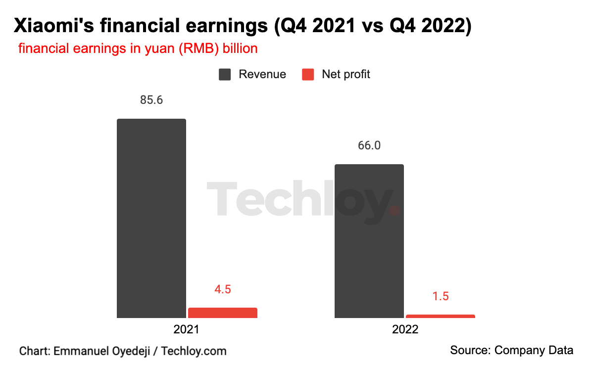 Xiaomi's revenue in the fourth quarter of 2022 reached 66.05 billion yuan ($9.6 billion), down 22.8% from 85.58 billion yuan a year earlier. The numbers were slightly ahead of analyst expectations, but they mark the fourth consecutive revenue drop for the company and its steepest on record yet.