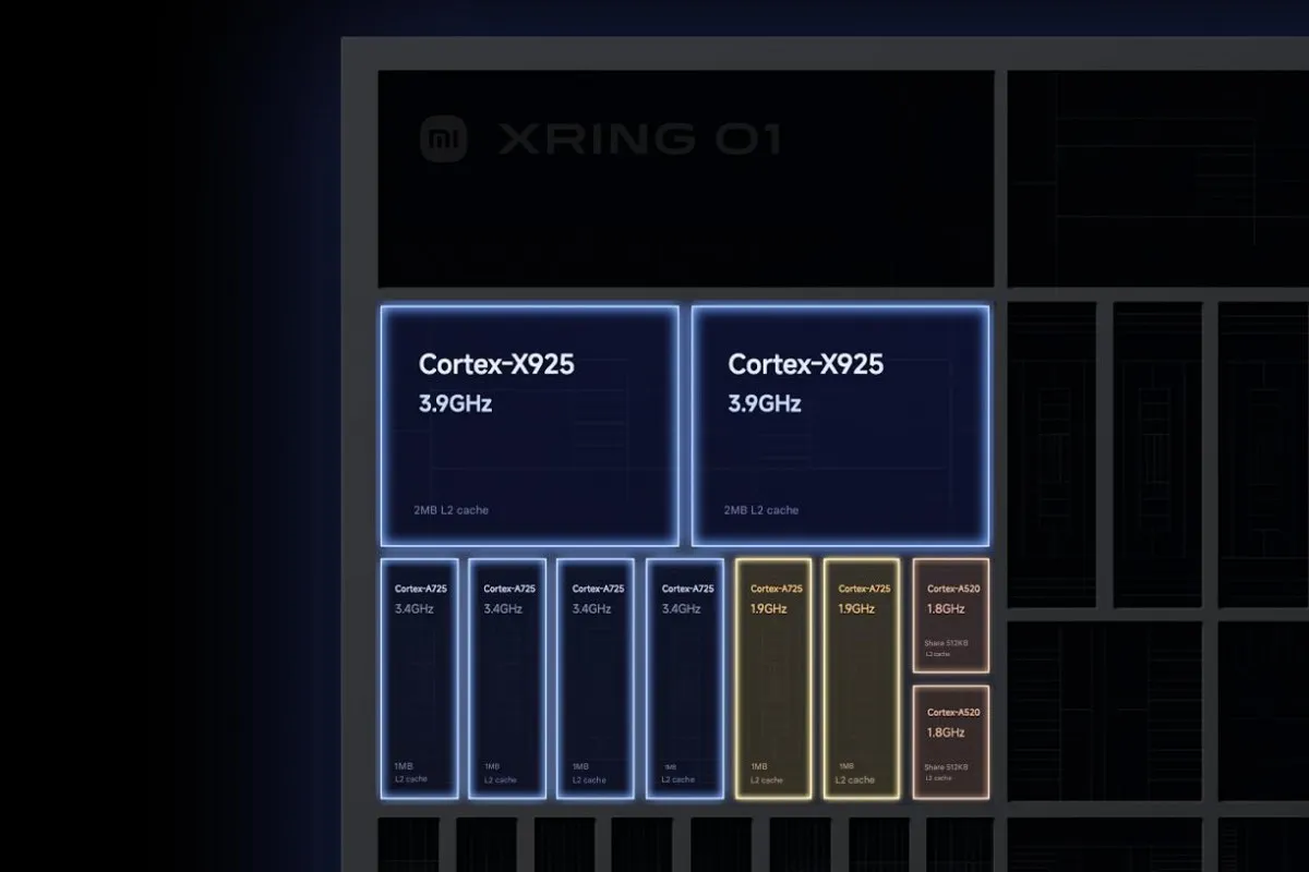 On paper, the Xring O1 holds its ground. Built on TSMC’s second-gen 3nm node, it features a 10-core CPU based on Arm’s v9.2 architecture. It boasts two Cortex-X925 cores running at 3.9GHz and a 16-core Arm Immortalis-G925 GPU —the same model found in MediaTek’s Dimensity 9400, though Xiaomi uses more shader cores. It also features a six-core NPU delivering 44 TOPS, matching the AI throughput of Qualcomm’s Snapdragon 8 Elite. This makes the O1 not just a bold internal project, but a chipset that, on paper, competes directly with the industry’s best.