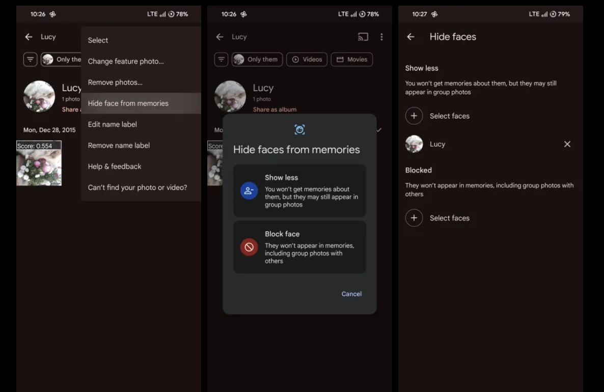 This feature is quite similar to the "Block face" option, with the only difference being that the "Block face" option also deletes faces from your group photos, while the "Show less" feature does not.